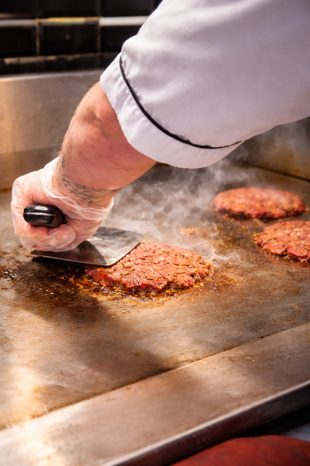 - On dépose une boule de viande hachée fraîche sur une plaque très chaude.